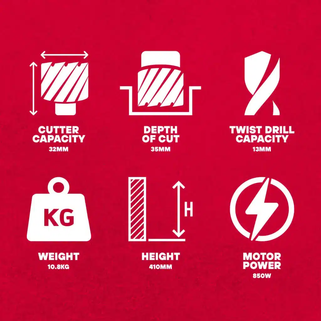 A lightweight, reliable single-speed drill, the Element 30 mag drill perfectly balances power and portability with ease. Its 31mm diameter cutting capacity and 35mm depth of cut are suited to a wide range of projects whilst its 850W motor packs a respectable level of power into its light 12kg frame.